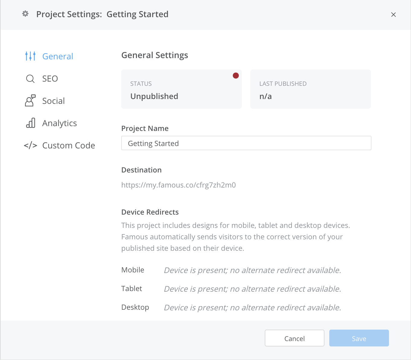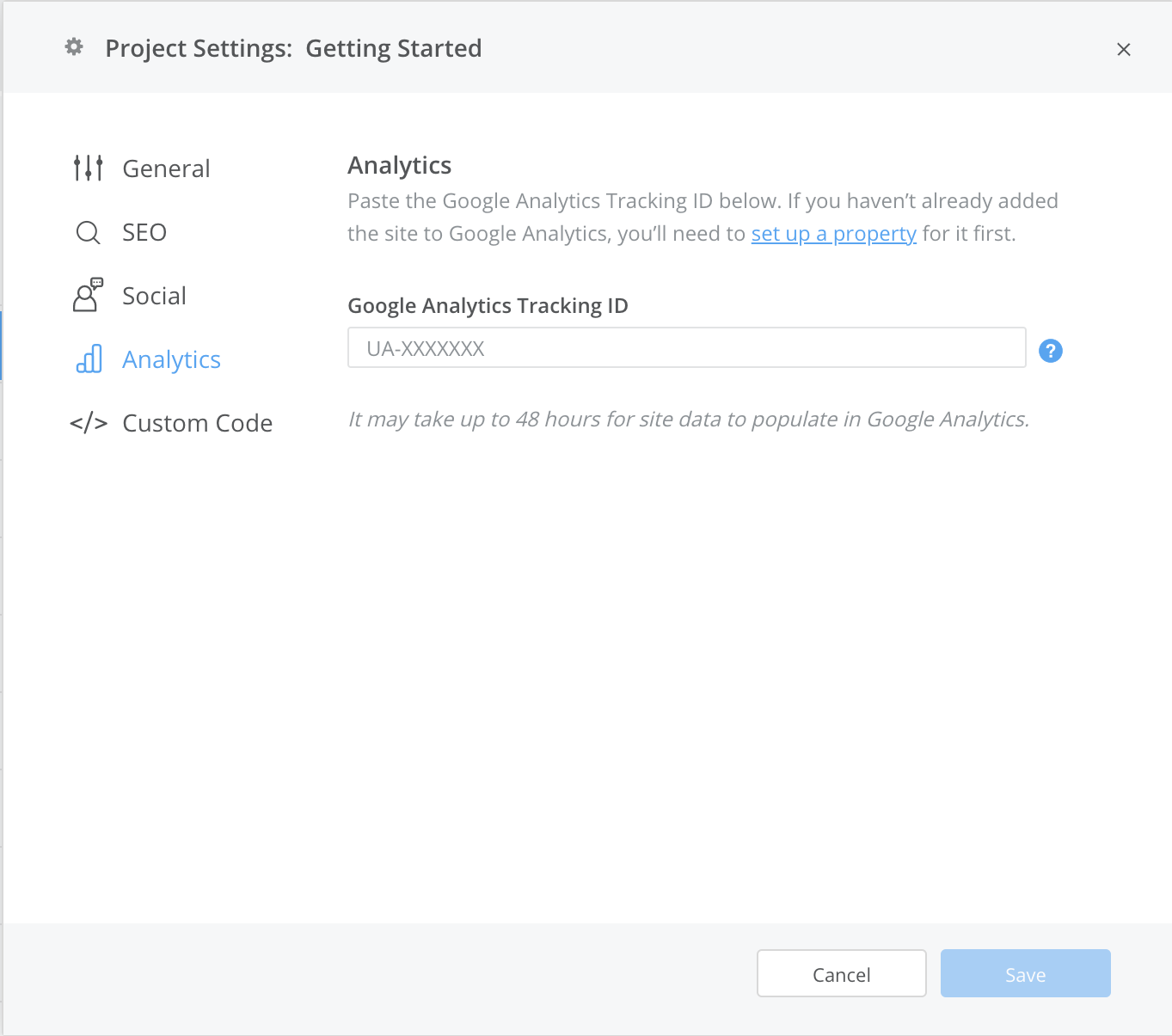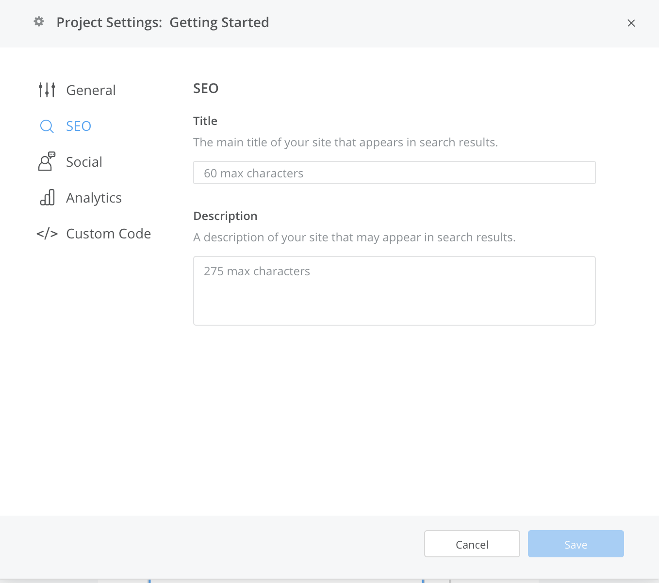 Project Settings Gear IconThe Settings menu is divided into five sections: General, SEO, Social Analytics, and Custom Code.
