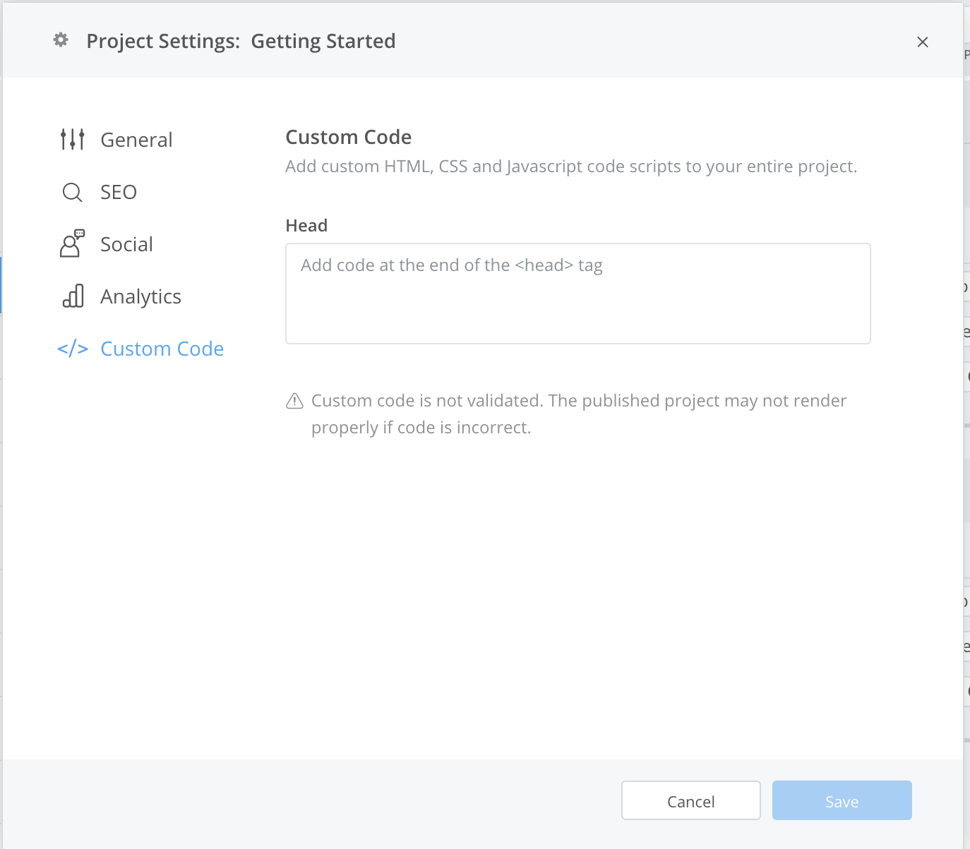 The Custom Code input field in Project Settings allows you to add custom code and scripts to your Amaze project. This can be useful for adding additional HTML, CSS, and JavaScript. Code is inserted in the Head tag and applied to the entire page. To ...