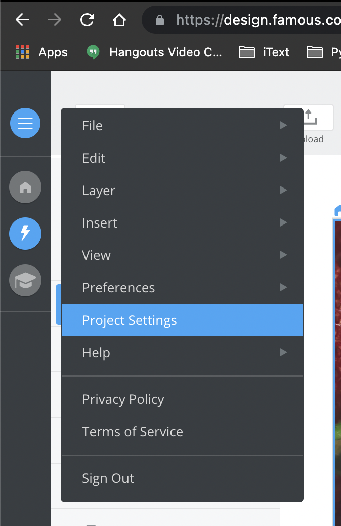 The Project Settings allows you to make changes to your project and add extra functionality. You can access the Project Settings menu from two places within the editor, the Hamburger Menu in the Left Ribbon and the Gear Shaped Settings icon in the top left corner of the editor.